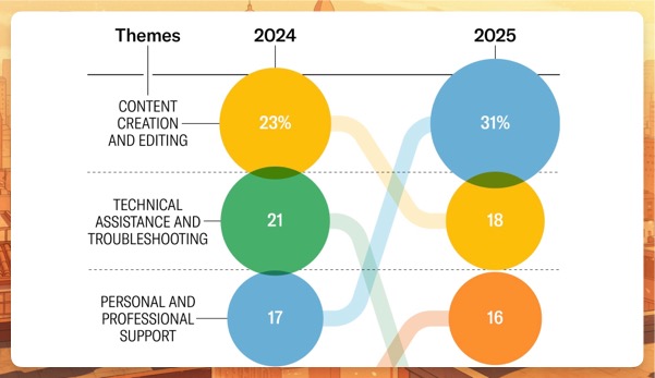 Therapy/companionship has shot to the #1 position, with “Organizing my life” and “Finding purpose” entering the top 5 as new entries. This reflects a broader movement toward self-actualization through AI, with users turning to these tools for practical assistance and emotional support.